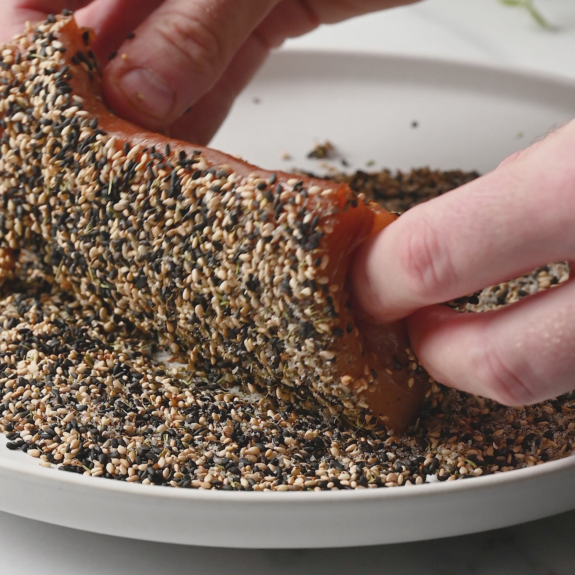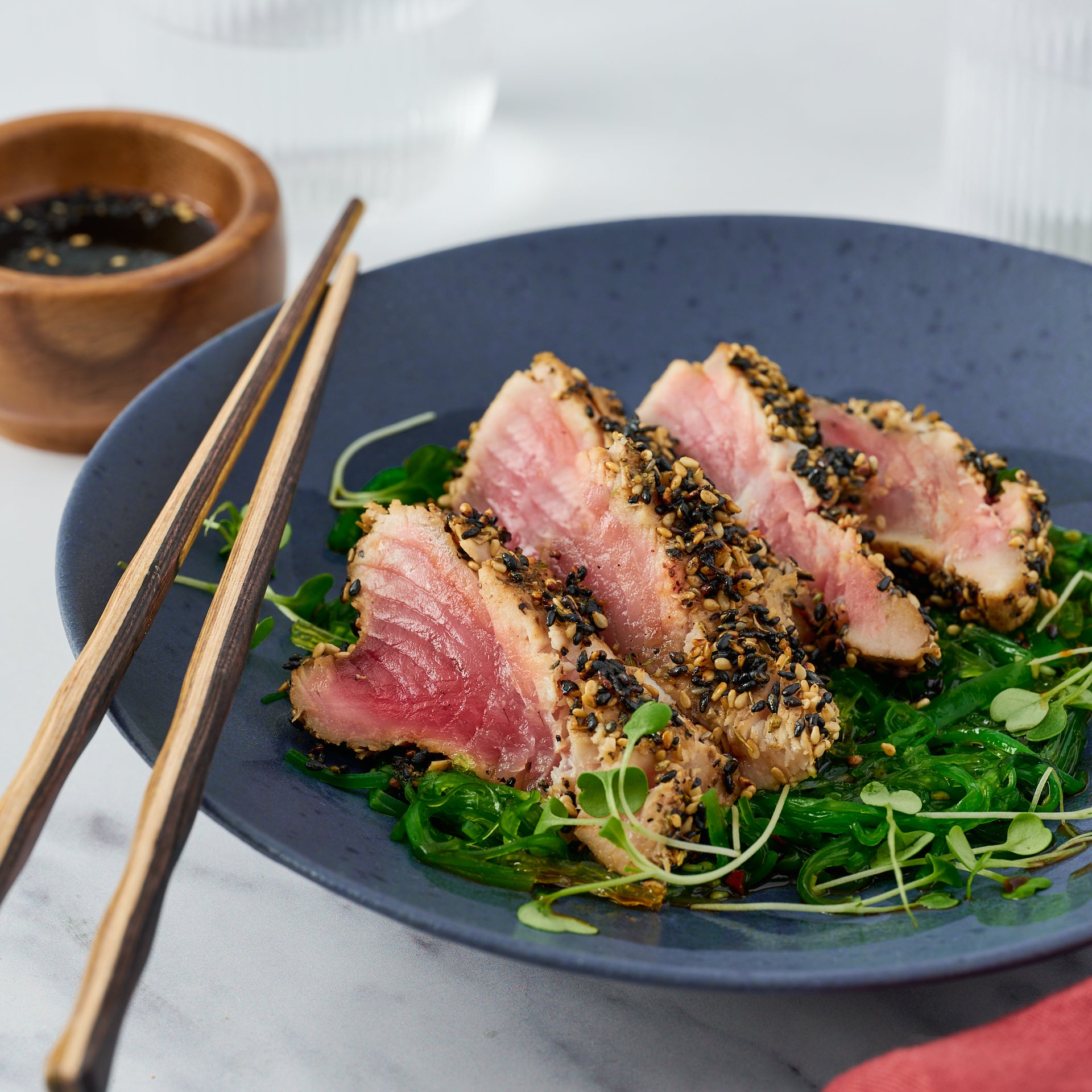 - Light Sear: Cover the tuna in sesame seeds and sear for 30 secs on each side.